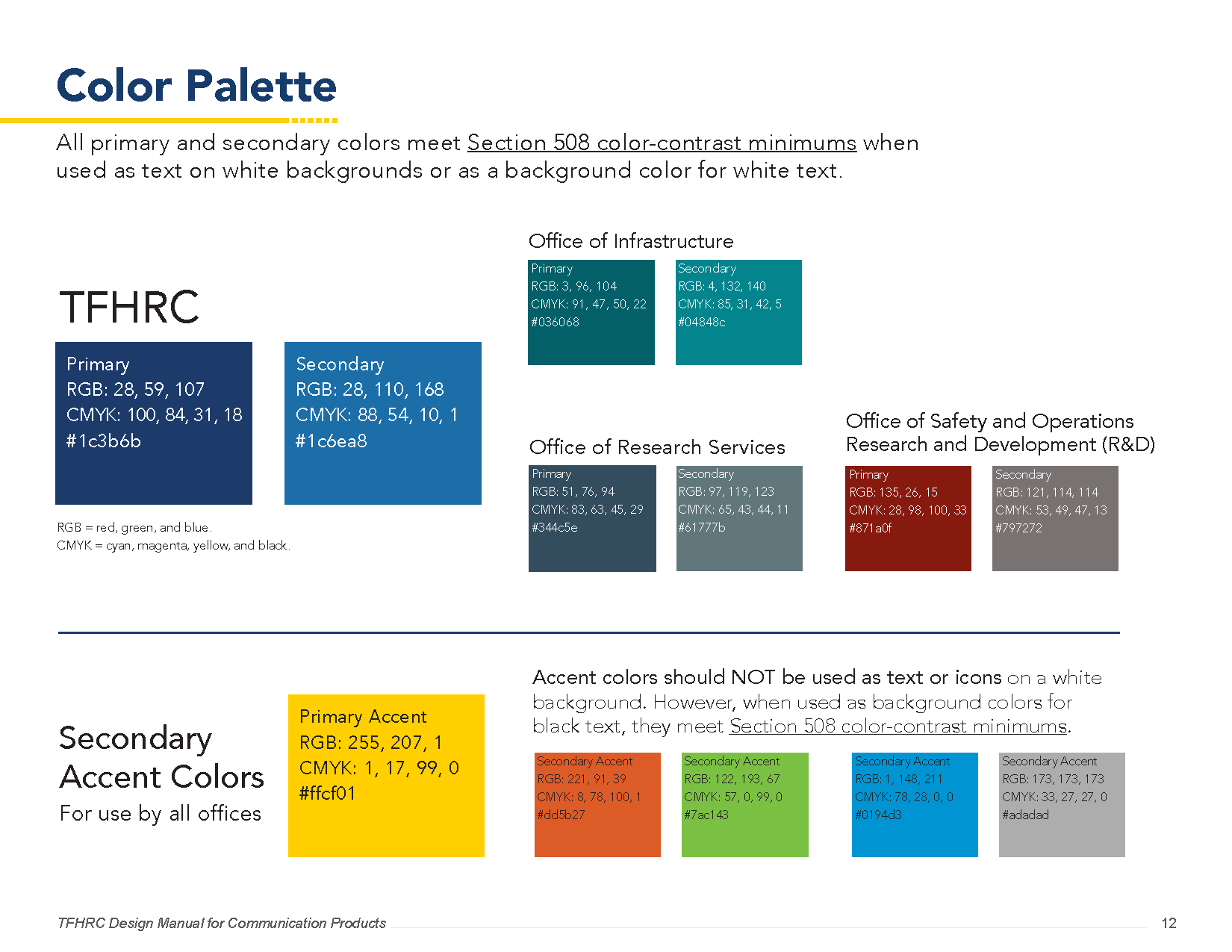 The Turner-Fairbank Highway Research Center (TFHRC) needed a comprehensive design system to unify communications across their diverse research divisions and partnership programs. Working with Schatz Strategy Group, I developed a complete brand manual that established visual standards for everything from typography and color palettes to video production and digital applications. The system balances federal accessibility requirements with a modern, professional aesthetic that positions TFHRC as a leader in transportation research and innovation.